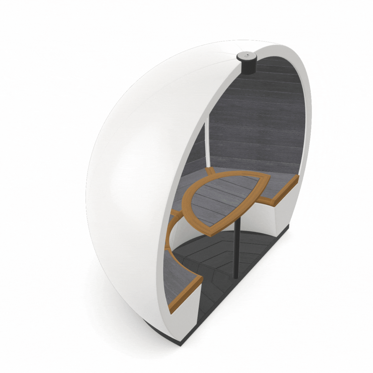 An outdoor adaptation of our ever-popular Escape Pods. Our Outdoor Orbs provide the same style and functionality whist also being able to withstand whatever the weather can throw at it. The Orb is offered in a 4 or 6 person configuration, with the option to add power to keep your phones and laptops charged even when you are outside